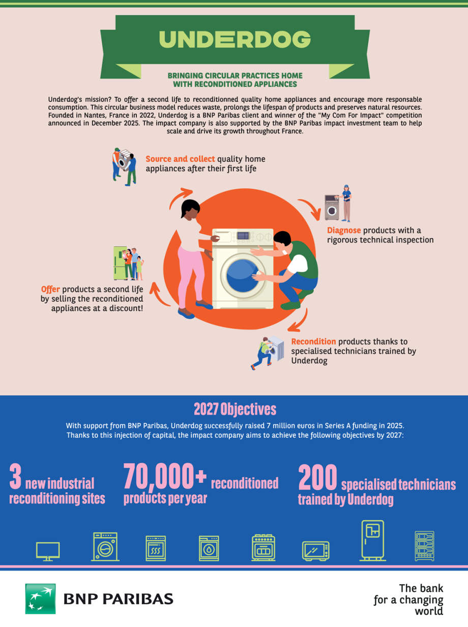 This “Circular Economy at BNP Paribas” infographic series highlights concrete examples of circular solutions supported by the Group. In this edition, discover how the circular economy makes the world go round with Underdog, a French impact company that offers reconditioned everyday household appliances to spruce up the home for less!